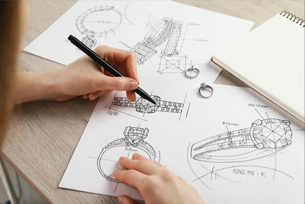 - To start: Schedule a consultation with one of our designers about five weeks before your desired delivery date. You’ll collaborate with your designer via email, using reference photos and sketches to develop your ring design.
